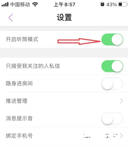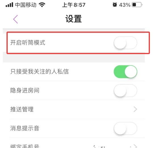 在蜜疯直播设置页面,点击【开启听筒模式】右边的开关