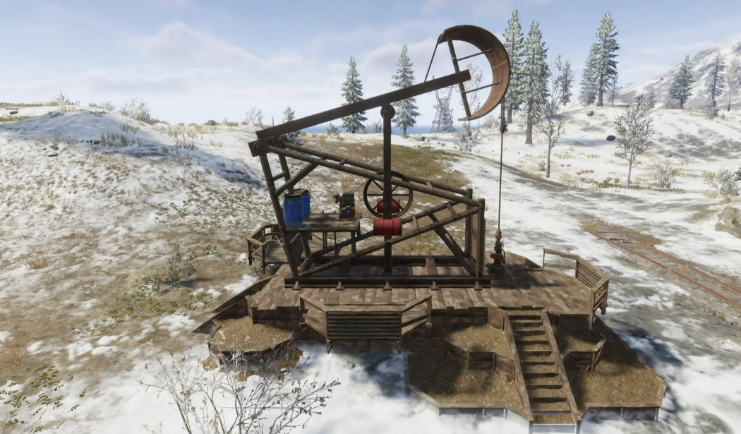 游戏地图上分布着不同类型的矿场,每个矿场旁边都配备了专门的挖掘设备。硫磺矿场有硫磺挖机,采石矿场有石料挖机,高级金属矿场则配备了金属挖机。除了这些常规矿场之外,像发电站和污水处理厂这样的中型据点也放置了挖油机。这些机器有个共同点,就是都需要消耗柴油才能运转起来。玩家只要往机器里投入柴油,它就会自动开始工作,持续产出对应的资源。