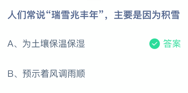 人们常说“瑞雪兆丰年”,主要是因为积雪?支付宝小鸡课堂开课啦!每天花一分钟答题赚饲料,喂喂小鸡就能贡献爱心啦!轻松又意义十足!2026年1月7日蚂蚁庄园的小鸡课堂题目正确答案是【为土壤保温保湿】,“瑞雪兆丰年”,主要是因为积雪为土壤保温保湿.