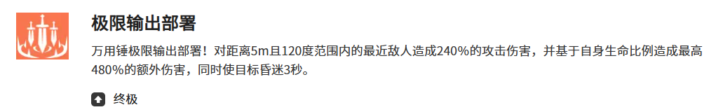 极限输出部署这个终极技能伤害倍率挺高的,对5米范围内120度扇形区域的敌人造成240个百分点攻击伤害,还会根据自身血量比例追加最高480个百分点的额外伤害。不过达芙妮毕竟是个捍卫者,输出能力不是她的强项,这个大招主要还是用来控制敌人,3秒眩晕时间能给队友创造不少输出机会。支援技能补充精力可以在使用主要技能后给全队减少30个百分点最终伤害,持续10秒,这个效果跟遗物的减伤叠加之后,能让整个队伍的生存能力得到明显提升。