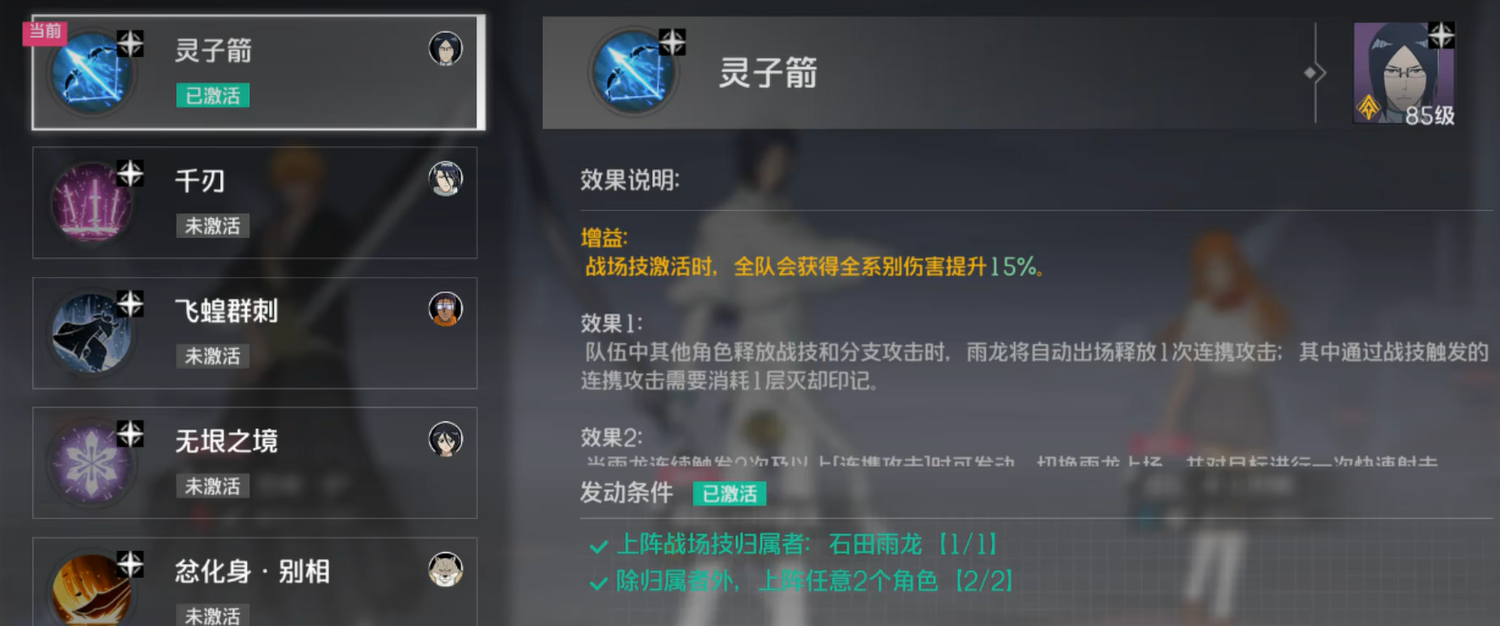 拿石田雨龙来举例子,他的战场技触发条件就比较特殊。用他的普攻打到第4段,还有释放技能和大招的时候,都会给敌人挂上一个灭却印记。这时候切换其他队友上场,用分支普攻打中带印记的敌人,石田就会自动出来帮忙攻击,释放技能也能触发,不过要消耗掉一层印记。如果在短时间里连续触发两次这种连携,就能解锁他的第一种战场技,石田会直接跳到空中一顿猛射。打着打着他的战场技能量条就会涨满,满了之后能放第二种战场技,是一发超大的灵子箭,打出来的伤害相当可观。