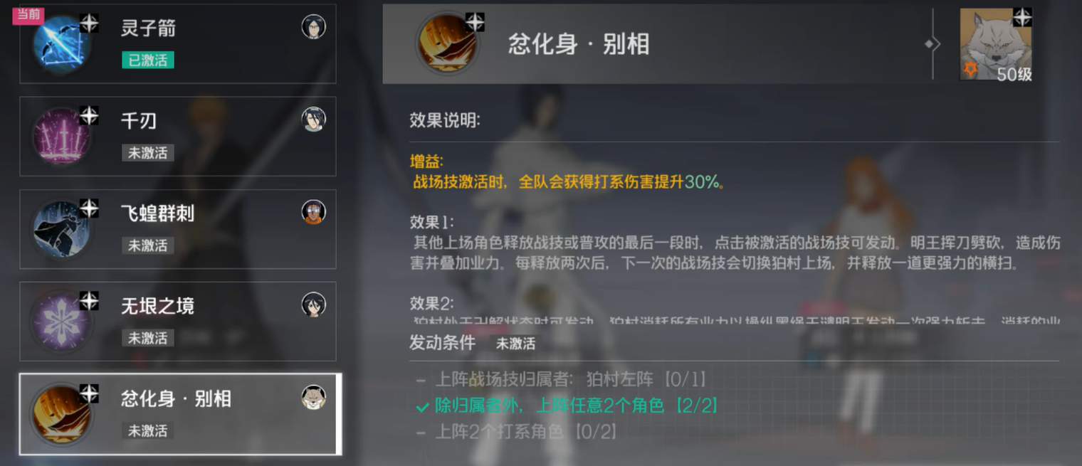 柏村左阵的战场技就更夸张了,他能召唤出黑绳天谴明王那个巨大的武士,拿着一把超大的刀在场上砍,这个画面做得跟动漫里几乎一模一样,召唤出来之后压迫感直接拉满。可以控制明王移动攻击,打起来特别爽。