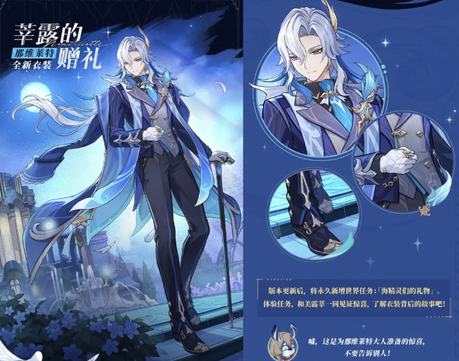 2、「月之四」版本更新后,那维莱特衣装[萃露的赠礼」永久上架商城。