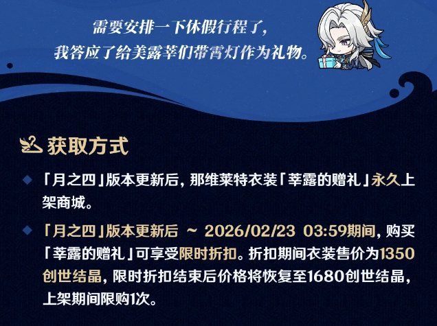 3、「月之四]版本更新后~2026/02/2303:59期间,购买[莘露的赠礼」可享受限时折扣。折扣期间衣装售价为1350创世结晶,限时折扣结束后价格将恢复至1680创世结晶,上架期间限购1次。