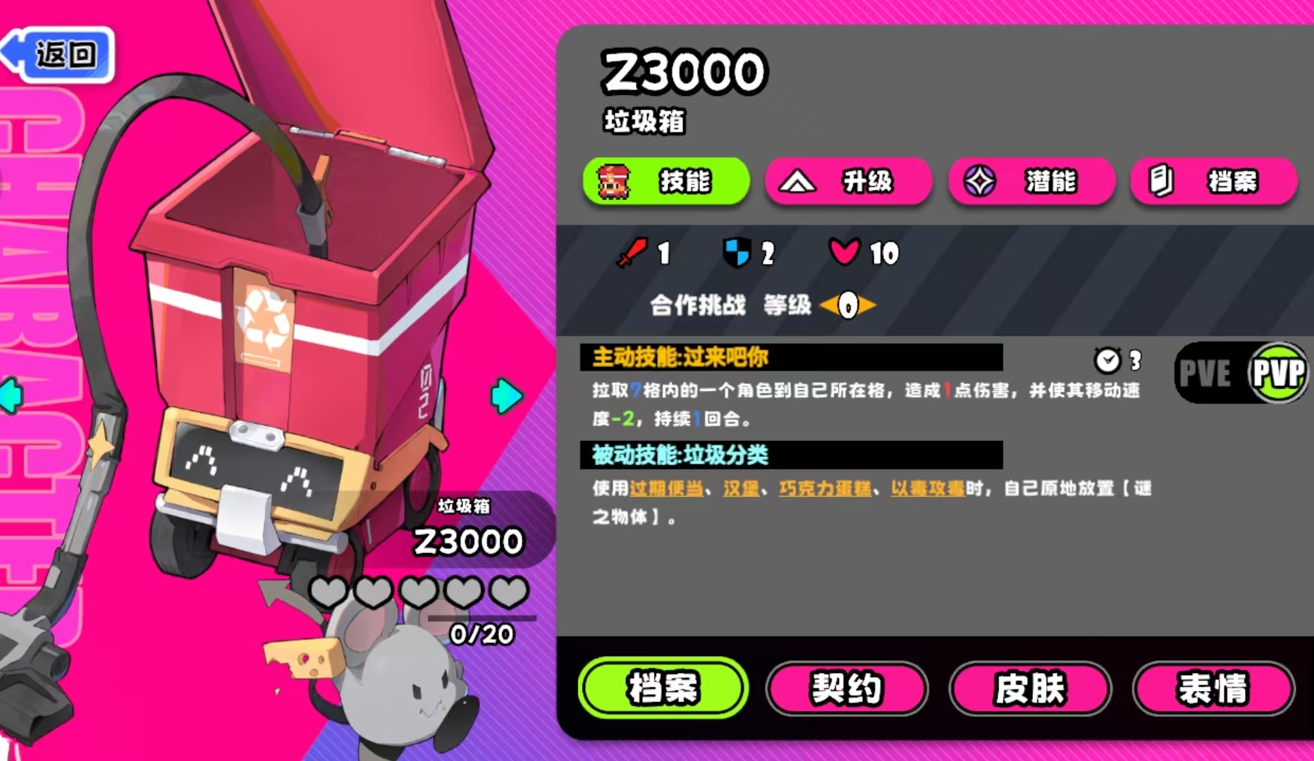 该角色的主动技能具备范围控制与伤害输出双重效果。在PVP对战中,垃圾桶可对7格内敌方单位施加牵引,造成2点基础伤害,并附加持续2回合的移速降低(-2),显著提升追击与收割效率。其被动机制则与手牌联动:每当使用过期便当类手牌后,将在当前所在格生成一个“迷之物体”,若对手移动至该格,将立即触发对应负面效果。因此,在标准对局中,该角色常被用于精准控场、限制走位,并配合残血收割策略快速积累星币资源。
