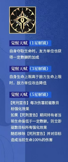 觉醒天赋方面:一星天赋使队友共享【生命上限夺取】的部分收益,实现资源协同分配;三星天赋在耶梦加得最大生命值高于任一敌方单位时,对其施加攻击力降低效果,配合持续夺取机制形成滚雪球式压制;五星天赋大幅升级【死刑宣告】——每次造成伤害前,强制驱散目标所有强化类增益;若目标当前生命值低于斩杀线,则立即清除全部增益并追加等同于其当前生命值100%的真实伤害。