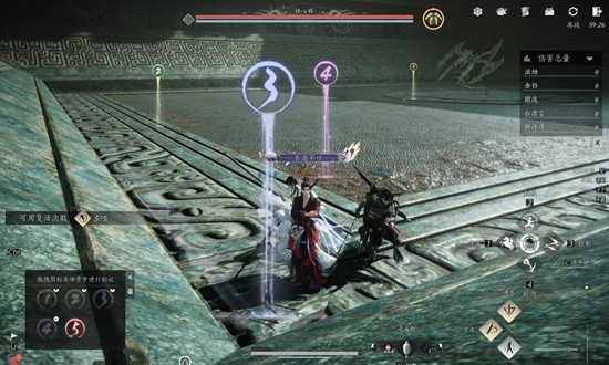 铁心蜈1-3:首先两只蜈蚣需要全部杀死,只扎一把刀,残血后输出补掉,接着参考图中的1号标点,在boss出黄光冲刺技能第一时间用武器技能打断即可。