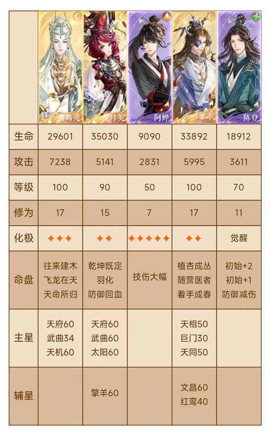 因为我的诸葛亮三星,其实不太好控制域,只要懂机制其实可以灵活一点,没有生存问题,阿婵和陈登都可以换其他密探,有时间我再试试优化(图是我优化过的,14回合选择先打1号,先打死1号,其他回合行动顺序也有些改动)
