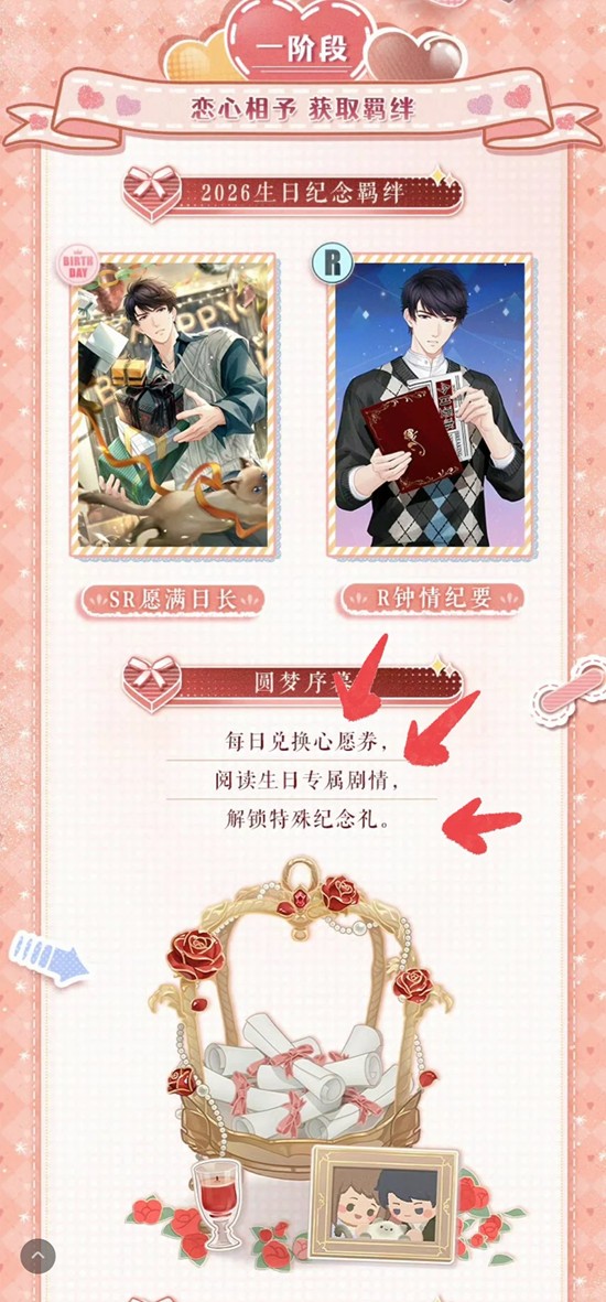 每日抽取心愿券,阅读专属剧情,解锁特殊纪念礼,生日当天记得进游戏过生日,拿生日背景