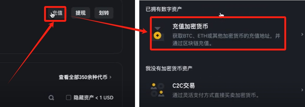 然后点击“充值”,选择“充值加密货币”。