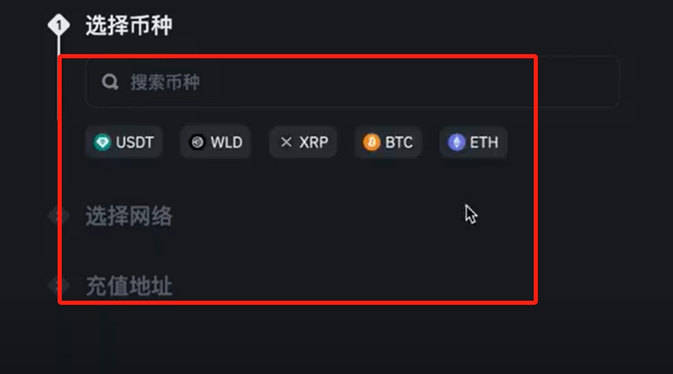 在这里您可以选择您要充值的币种及其网络。然后复制您的储值地址。