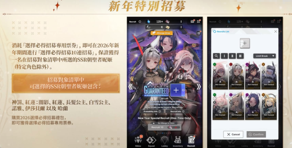 本次活动定档于2026年新年期间上线,采用定向保底招募机制。活动开启时,所有玩家均可免费获得1张“新春特别招募专用票券”;后续票券需通过限时礼包购得。招募支持10连抽模式,每次10连必出1名指定SSR角色——即“朝圣者妮姬”,该角色不在常规保底池中(特定角色除外)。本次限定卡池涵盖多款高人气角色,包括神罚、红莲、长发公主、白雪公主、伊莎贝尔等,覆盖多种视觉风格与战斗定位,兼顾收藏价值与实战强度。