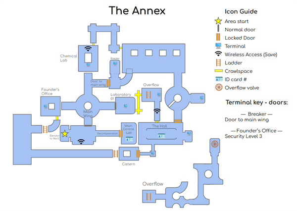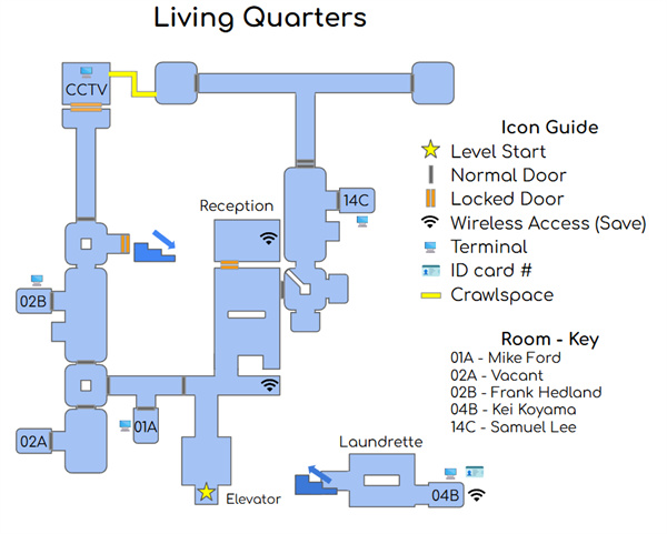 它们不是完全按比例排列,但有方向性,并且能与其他地图和区域连接。这些地图包括锁门和终端位置、区域名称和门禁卡位置,但略过了一些过渡地图。