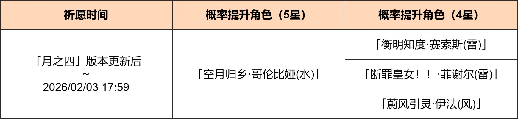 ●活动期间,4星角色「衡明知度·赛索斯(雷)」「断罪皇女!!·菲谢尔(雷)」「蔚风引灵·伊法(风)」的祈愿获取概率将大幅提升!