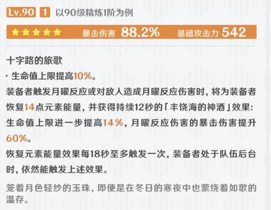 装备者触发月曜反应或对敌人造成月曜反应伤害时,将为装备者恢复14点元素能量,并获得持续12秒的「丰饶海的神酒1效果:生命值上限进一步提高14%,月曜反应伤害的暴击伤害提升60%