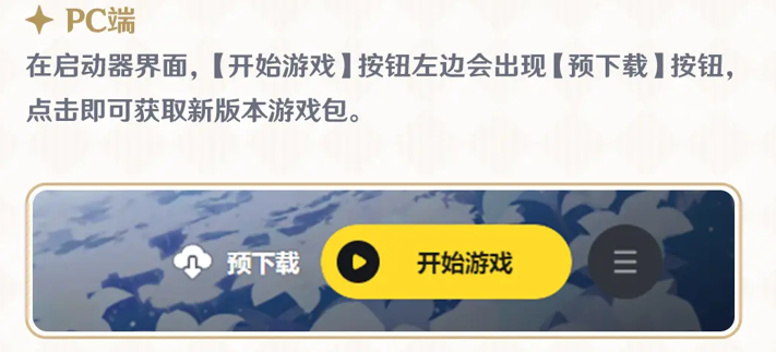 在启动器界面,【开始游戏】按钮左边会出现【预下载】按钮,点击即可获取新版本游戏包。