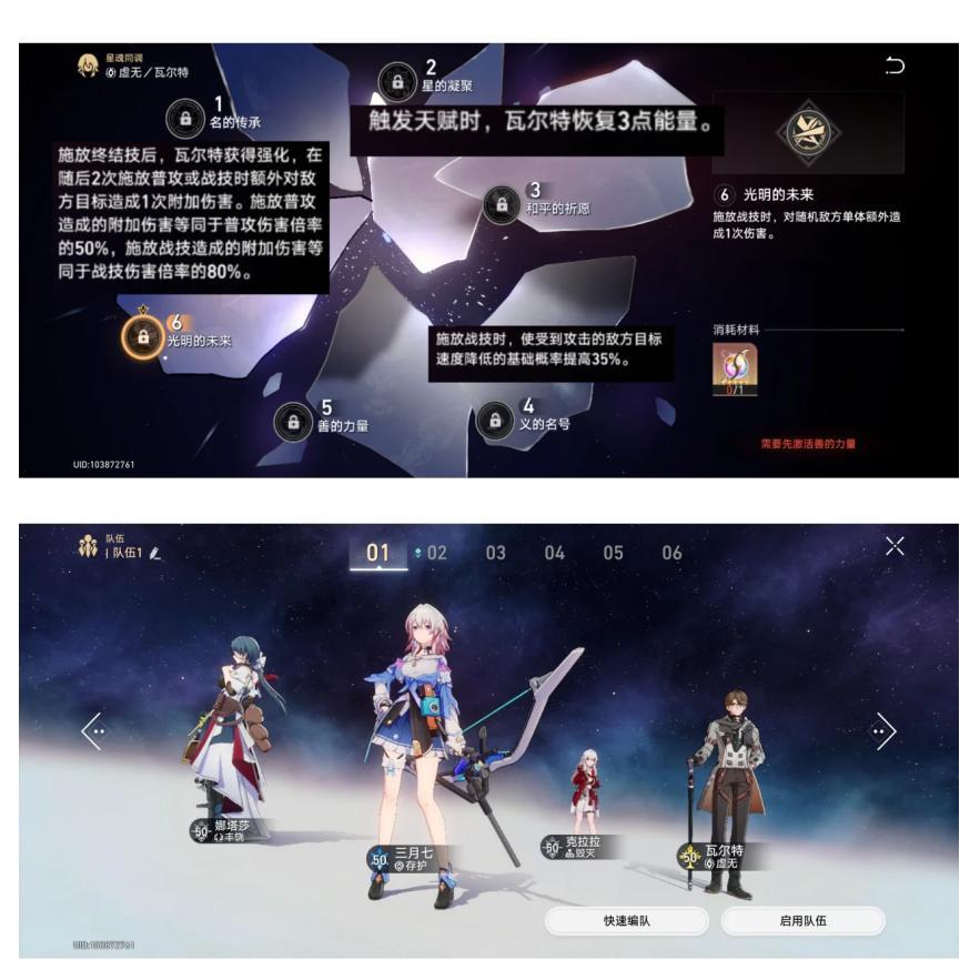 说明:1和6是直接增伤,2是增加充能,4是增加敌人减速概率。瓦尔特是常驻角色,慢慢等歪就好。星魂到2时,他已经是个很好的输出了。
