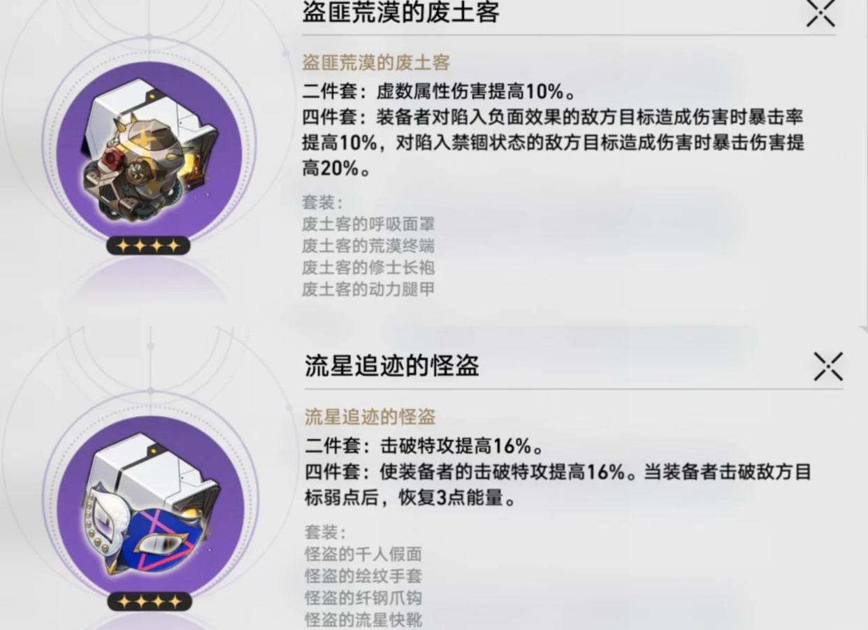 4件套套装:废土客4件套首选,适用于大部分场合。如果想要让瓦尔特专门针对虚数boss,怪盗4件套会更合适。