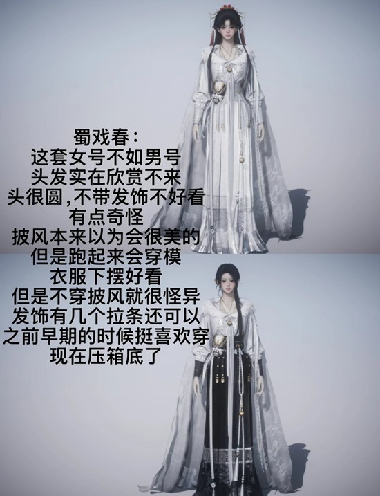 蜀戏春:这套女号不如男号,头发实在欣赏不来头很圆,不带发饰不好看有点奇怪,披风本来以为会很美的,但是跑起来会穿模