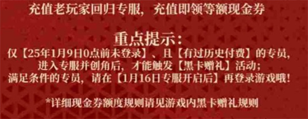 活动对象:2025年1月9日零点前登录过的老玩家,并且账号内有充值记录。
