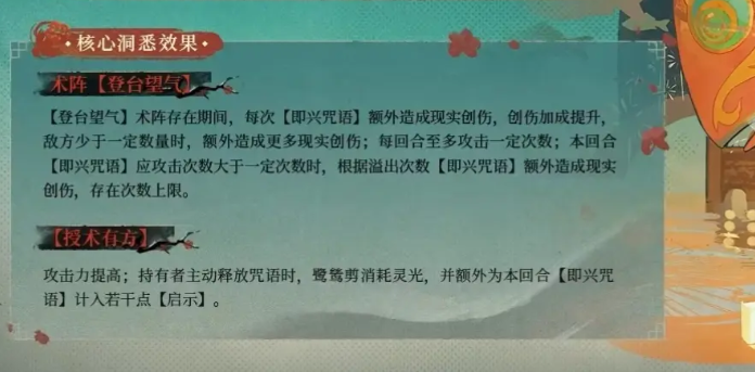 ·【洞见天机】:不同等级下对术阵效果强化,可提升【即兴咒语】分裂攻击系数、额外造成的现实创伤与穿透率;【洞见天机】结束时回到上一级,再次强化时刷新持续时间。