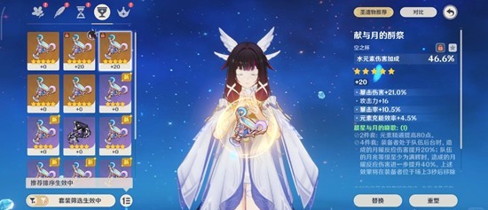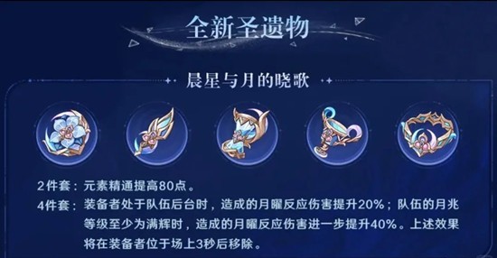 ●后台型输出首选晨星套,提供80点精通以及60%月曜反应增伤,但需注意队伍配置必须要满辉才能吃满加成,并且切入前场不要超过3秒;