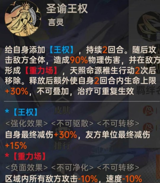 释放言灵“圣谕王权”是天照命的核心。技能发动后,源稚生自身获得持续2回合的“王权”状态,期间自身减伤提升30%,全体友方获得15%减伤。同时,该技能会对全体敌人造成伤害,并在敌方阵营制造一个“重力场”。重力场能降低场内所有敌人10%的攻击与速度,其持续时间将持续到天照命行动2次后。此外,释放技能后,天照命会立即获得一个相当于自身生命上限30%的治疗效果,此生命上限加成不可叠加,但治疗效果可重复生效。