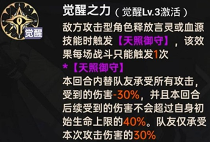 天照命的觉醒技能带来了“超重力”机制。当处于重力场中的敌人攻击天照命时,会为其叠加一层“超重力”状态。携带超重力状态的敌人,每次行动结束后都会受到基于天照命攻击力的真实伤害,该状态最多可叠加3层。这一机制使得敌方在重力场内持续行动会不断承受真实伤害,有效压制高防御目标。