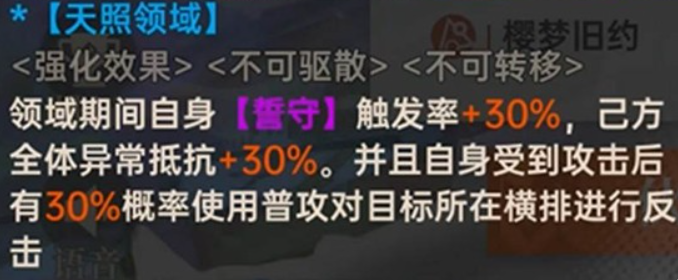 开启天照领域后,源稚生的防守反击能力得到显著强化。领域期间,自身的“誓守”触发率提升30%,同时全队的异常状态抵抗获得提高。最关键的是,当天照命受到攻击时,有30%的概率使用普通攻击反击目标所在的整排敌人,这使他能有效反制敌方的集火。