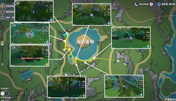 在湖中垂柳的正下方的三个位置可以采集到9个。