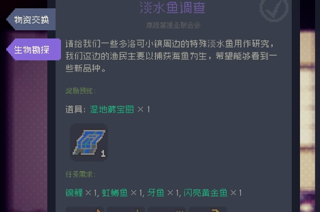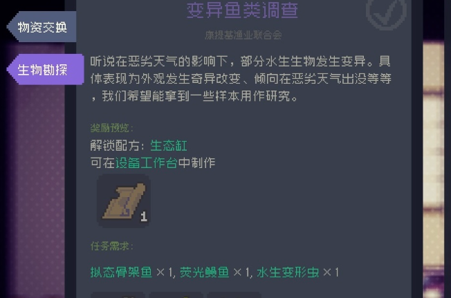2、第二个任务的鱼类,需要环境改造器「三级改造」之后才会出现。 需要注意的是,每种鱼类出现的时间不同,也是需要提前准备的