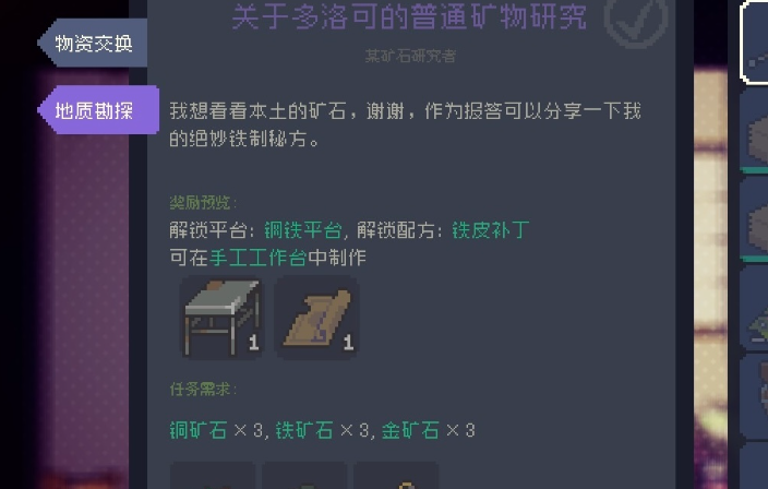 1、矿石收集:第一个任务是需要你收集三种不同的矿石,铜矿石和铁矿石比较容易获取,重点在于金矿石