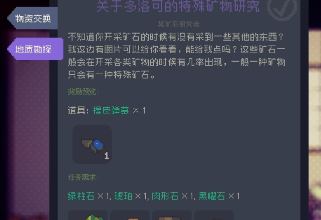 8、特殊矿石:这个任务需要你收集「绿柱石」「琥珀」「肉形石」和「黑曜石」
