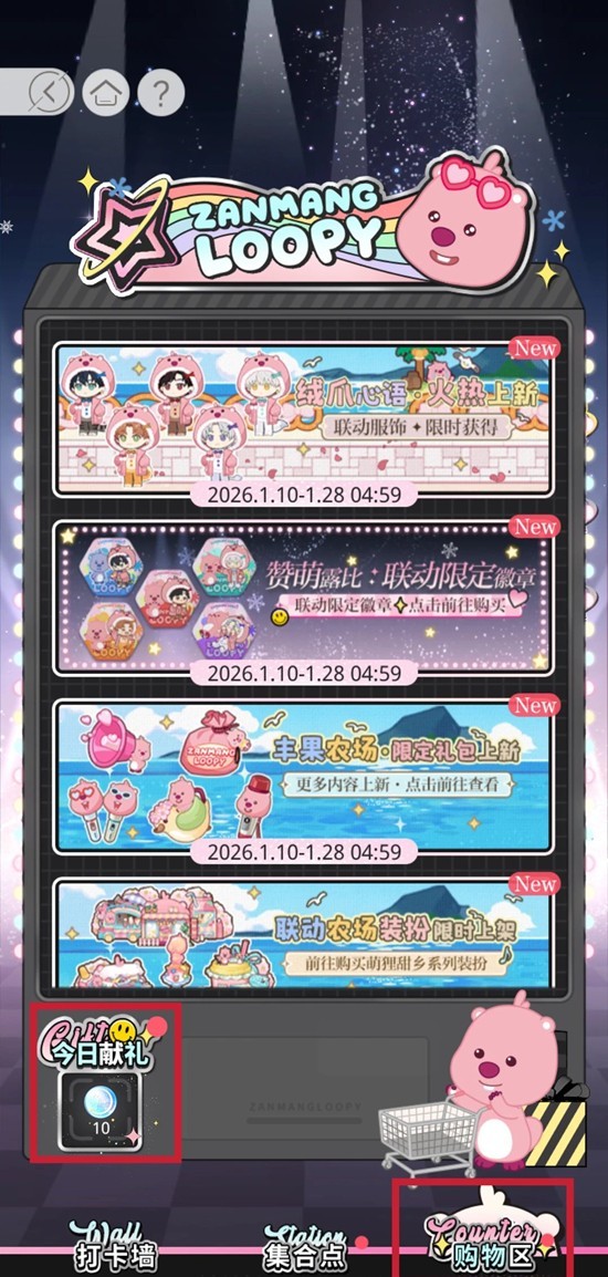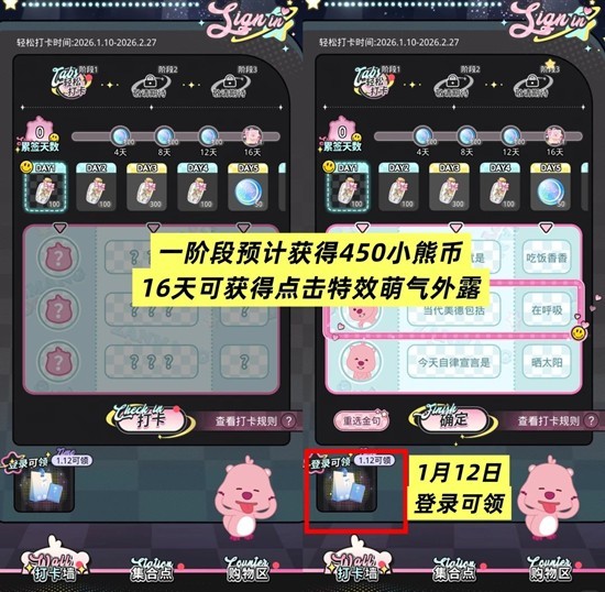 1. 每日可免费在轻松打卡墙进行一次打卡,获得[萌趣愿瓶]等奖励。