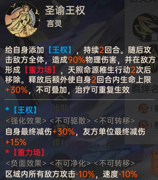 释放言灵“圣谕王权”是天照命的核心。技能发动后,源稚生自身获得持续2回合的“王权”状态,期间自身减伤提升30%,全体友方获得15%减伤。同时,该技能会对全体敌人造成伤害,并在敌方阵营制造一个“重力场”。重力场能降低场内所有敌人10%的攻击与速度,其持续时间将持续到天照命行动2次后。此外,释放技能后,天照命会立即获得一个相当于自身生命上限30%的治疗效果,此生命上限加成不可叠加,但治疗效果可重复生效。