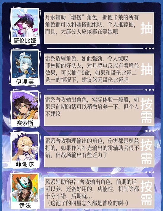 伊涅芙:雷环斯的好队友,对月感电反应有着增益雷系盾辅角色,如此强劲,令人惊叹效果,可以抽个0命,如果和哥伦比娅二选一的情况下,建议悠闲哥伦比娅吧