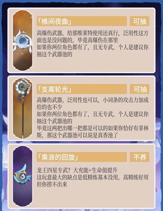 高爆伤武器,给那维莱特使用还真行,泛用性这方面也是没问题的,毕竟高爆伤在那里如果你两位角色都有了,且无专武,个人是建议你抽这个武器池的