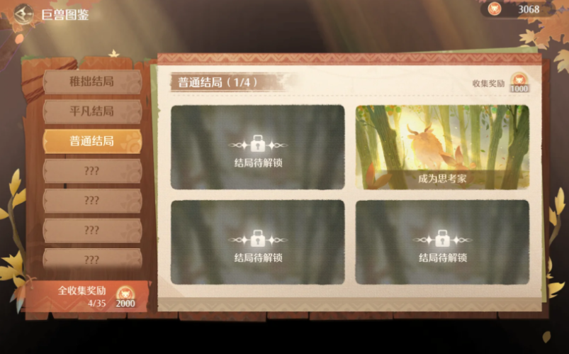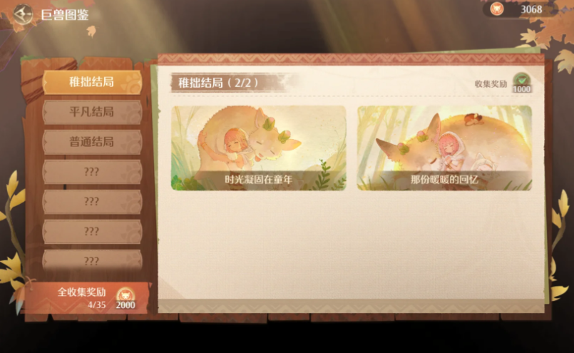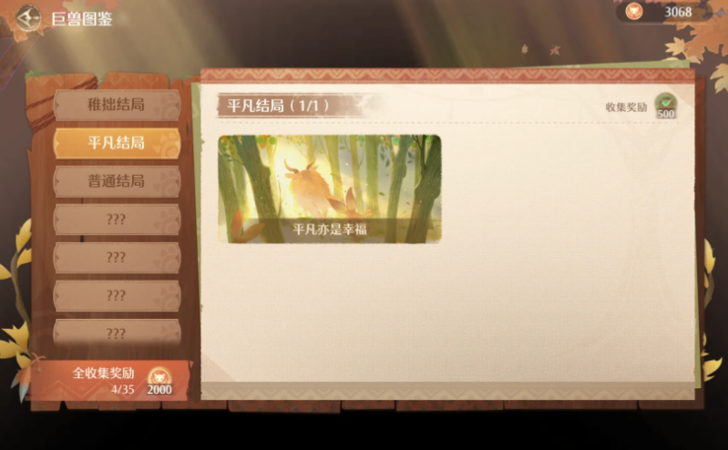 完成结局《平凡亦是幸福》,达成条件总值>1996,且没有A和S。保险起见建议全B——也就是每种属性不超过999且相加>1996。注意均衡每种属性数值。这个时候要开始做一些设施游玩,因为要拿到600钻。均匀分配游玩设施、喂食、亲密互动,以及清洗小巨兽