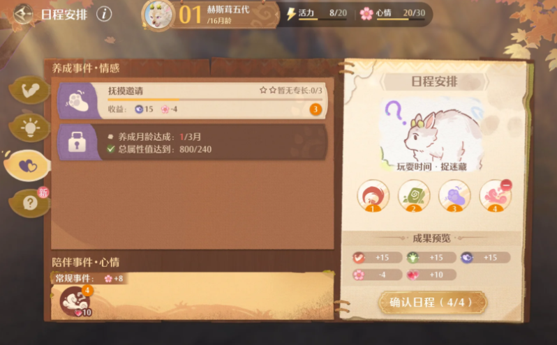 无限暖暖2.1巨兽养成玩法较为繁琐重复,需要重复刷结局,养成一只过后还需要继续养成。第一只巨兽可以直接每日日程安排无限选常规事件;第二只巨兽直接安排日程;第三只巨兽注意均衡每种属性数值,均匀分配游玩设施、喂食、亲密互动,以及清洗小巨兽;第四只巨兽可以在普通结局里4选1,均衡每种属性数值。