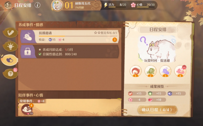 完成结局《时光凝固在童年》,达成条件总值<600。不需要点任何互动、设备使用和喂食,直接每日日程安排无限选常规事件,不需要安排任何养成事件,控制总属性全C并相加<600,直至16月龄养成结束。