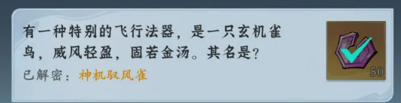 5、有一种特别的飞行法器,是一只玄机雀鸟,威风轻盈,固若金汤。其名是?神机驭风雀