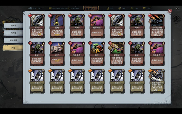 4个轴承(3选一)升级版4个机械悬挂(抽二)顶配4个改良轮胎(牌堆里选一张)。出千(1费获得循环buff,丢多少牌抽多少牌)一两张赌注(1费丢所有牌,丢多少抽多少)2张转向(1费0油前进牌,有加速抽一)4张掩护(0费抽二丢一,配件成型后可以只留一张防止打海了没费用用赌注)4张预备(0费回一费)最后的冲刺(1费5油,打出汽车卡抽一同时除外这张汽车卡,增加舒畅度的卡,要不汽车卡全拿手里卡太多太碍事了)魔术师(3费2弹丢所有手牌,伤害=丢手牌的数量*0.4战斗)提灯(0费丢所有事件卡,每丢一张回一费)。