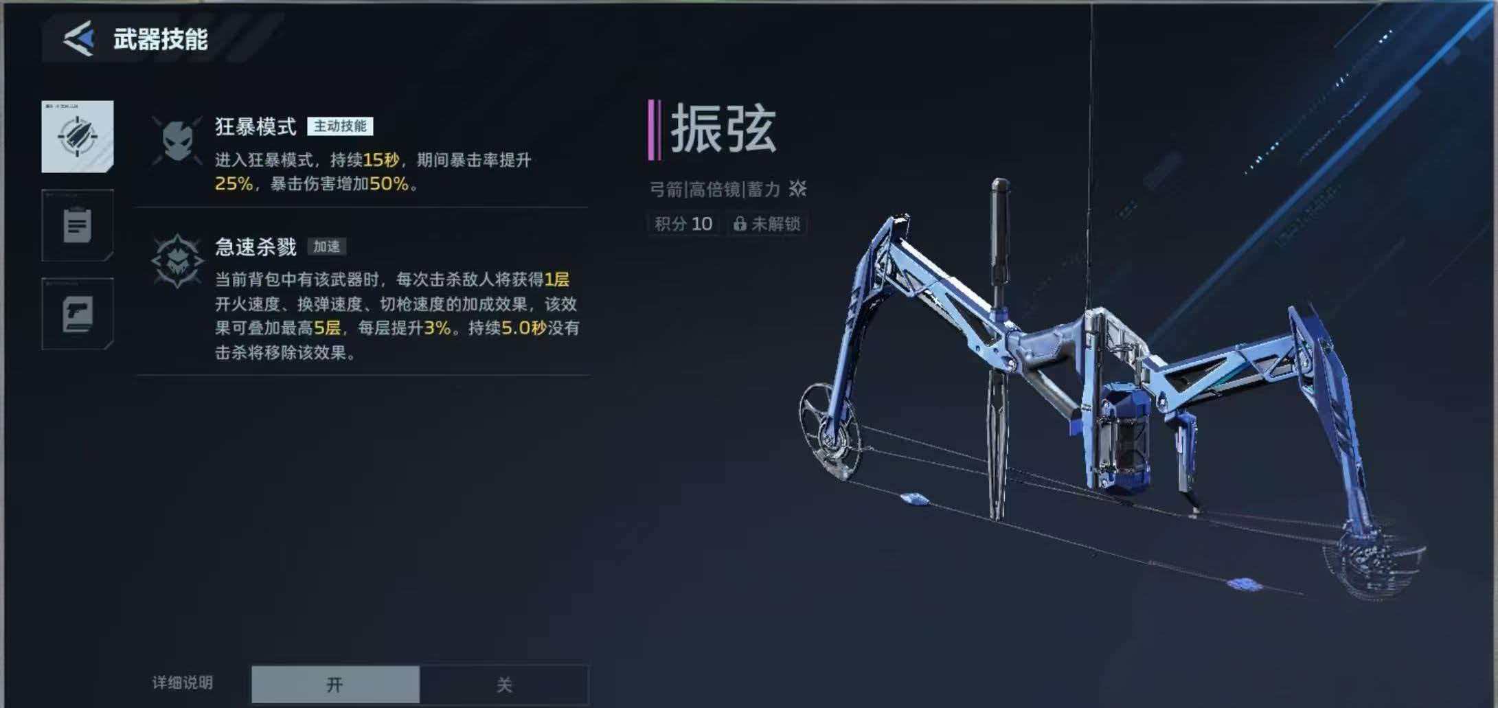振弦则侧重持续作战与节奏增益。其单发伤害与射速略低于超级复合弓,但技能逻辑更强调“滚雪球式”成长。主动技能“狂暴模式”激活后,射速提升25%,暴击伤害提高50%,且每次命中均可叠加15%的总伤害加成;被动技能“急速杀戮”无需装备即可生效——只要振弦存在于背包中,玩家每完成一次击杀,即永久获得一层增益,涵盖开火速度、换弹速度与切枪速度三项关键操作参数,适合高频交火的近中距离对抗。