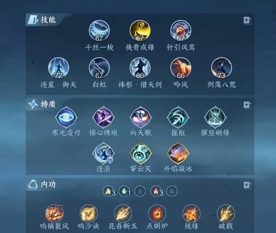 带针引绝技的话特质就用普通锦心,然后把千丝和针引都染成蓝色;带鸣刃绝技特质就用华彩锦心。剩下特质照抄就行,如果内功有很多根骨词条也可以用狂霆替换寒光,会心面板入战大于三万就用破云,没有三万就用摧坚