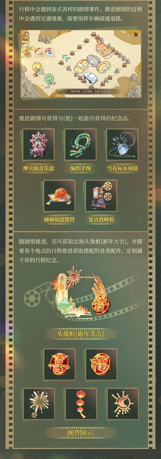 随剧情推进,还可获取定制头像新年大吉,并随着各个地点的日程推进获取搭配的各类配件,定制属于你的行程纪念。