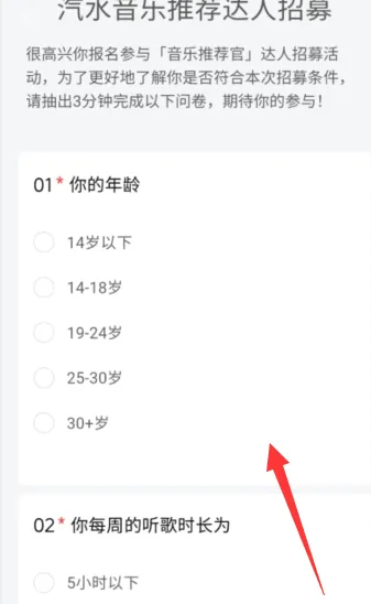 即进入汽水音乐推荐达人招募页面,填写年龄及听歌时长等内容,点击下方的【提交】,即可完成申请。(如图所示)