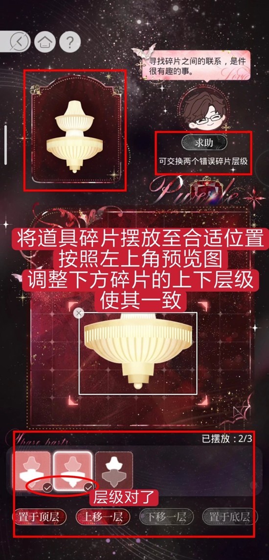 将道具碎片摆放至合适位置,按照左上角预览图调整下方碎片的上下层级,使其一致。