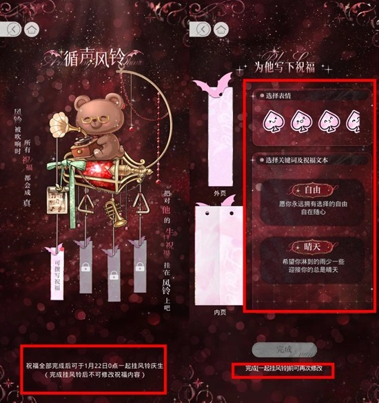 ①写下【循声风铃】中的全部祝福后,1月22日00:00起将解锁Live2D祝礼互动玩法。