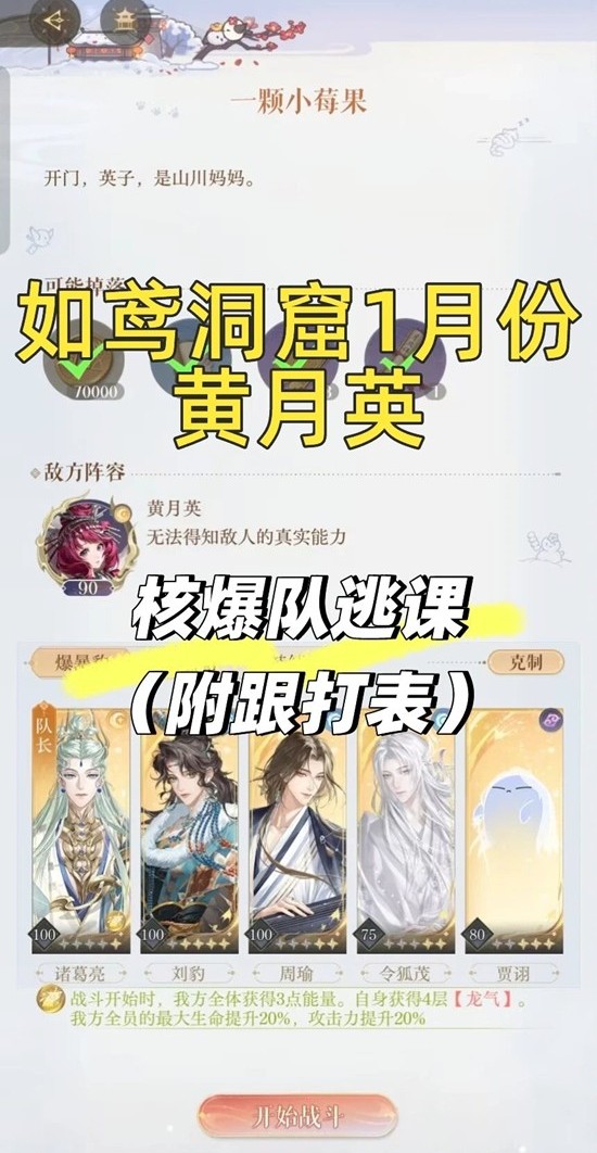 以上就是如鸢一月神秘洞窟,黄月英洞窟核爆打法配队攻略的全部内容了,更多游戏资讯,攻略内容敬请关注,您的支持是我们努力的动力!