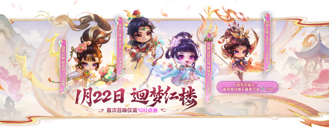 红楼踏雪迎福礼,首双周兑换折扣限时开启:1月22日更新后至2月4日23:59,可选择1个【迴梦红楼】系列小小英雄,以折扣价进行兑换,最高可省190棱彩兑换石。